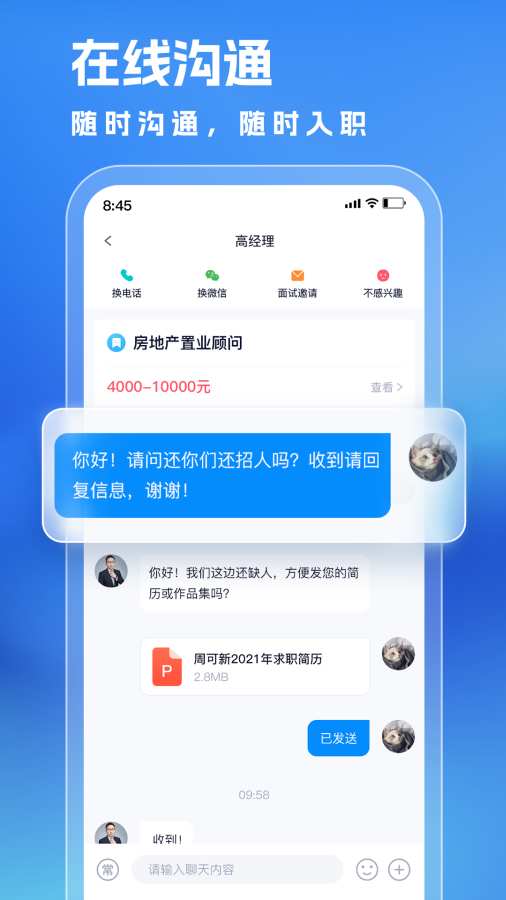 【快】一键报名即时开聊,足不出户,在线了解职位/求职者细节