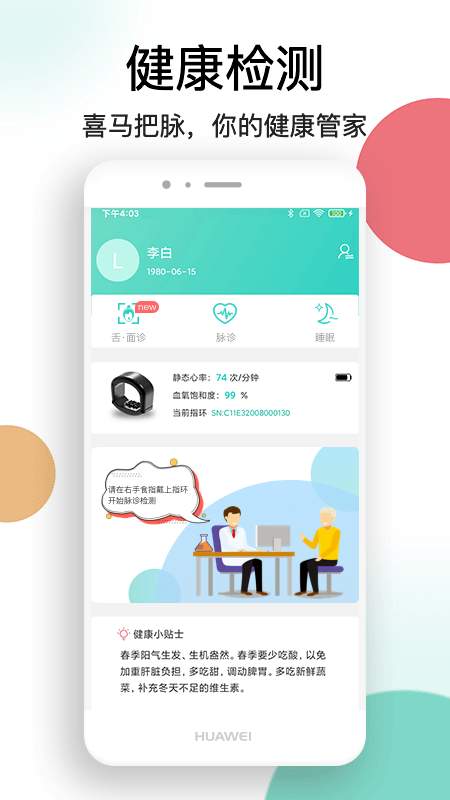 喜马把脉是一款功能强大的健康管理工具,使用指环内置的光感元件采集手指的光强彼岸花,从中获取血氧、心跳波动及血管容积周期性变化信号,转换成中医经络数据。通过分析周报告和月报告可以观察记录自身和家人的健康情况,根据用户的检测结果提供专业建议,做你的健康管家。#喜马把脉适合人群#:- 希望了解自身健康状况的你- 时常感到身体不适的你- 关心家人的你- 睡眠不佳、时感疲惫的你#报告内容#:- 风险预估- 体质辩证- 脏腑辩证- 调理建议 来自应用汇: 喜马把脉