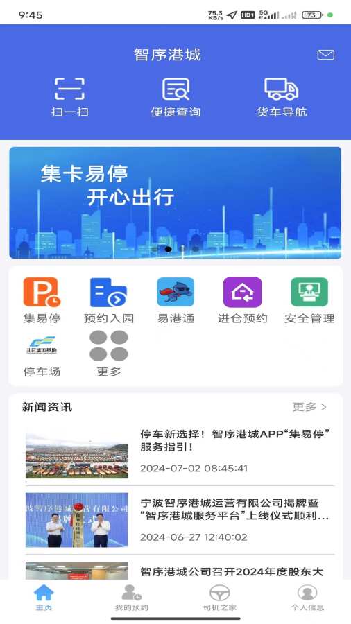 【集易停】对接北仑区内国有停车场和部分社会停车场,给予司机线上预约停车服务,解决司机群体刚需。 【园区“智”约】通过封闭化交通管理,有效促进园区企业高效开展作业,促进企业高效作业并保障货车队伍整齐有序。 【信用“智”评】以集装箱道路运输企业及相关从业人员的信息为基础,结合主管部门对应用对象进行综合评分,促进行业市场良性循环发展。 智序港城司机端APP是智序港城数字化改革服务相关应用和一体化平台,适用于宁波舟山港域相关的港航物流业务以及配套服务,包含集易停、园区“智”约、信用“智”评、司机“智”家、易港通服务等业务,集卡车司机通过此APP高效办理港城业务。