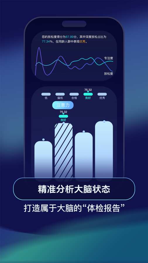 超脑电APP是一款专为老年人设计的脑健康管理应用,结合前沿脑机接口技术,搭配水母星球脑机设备,助力实现大脑“早检测、早发现、早干预”。我们提供科学、有趣的健脑训练与专业评估,帮助您积极应对认知衰退,保持大脑年轻状态。 一站式生成您专属的“大脑体检报告”,涵盖多项专业测评1.脑电测评——实时监测大脑专注与放松程度,直观了解大脑状态。2.阿尔兹海默症风险筛查——融合脑电波分析、肌肉力量测试与专业量表,三维精准评估AD风险。3.多维认知能力测评——从注意力、记忆力、语言能力、灵活性、计算力到空间感知,全面评估您的认知健康水平。4.健康筛查——整合多个国际标准量表,涵盖睡眠、焦虑、抑郁、神经衰弱等8大筛查项目,全面守护身心状态。科学健脑训练 1.神经反馈训练——帮助个体对目标脑神经活动进行自主调节和改善,改善大脑的血流灌注,延缓认知衰退。2.正念放松训练——调节自主神经系统,缓解焦虑抑郁,提升心理韧性和身体放松感。3.多维认知游戏——根据测评结果,定制包括注意力、记忆力、语言等六大维度的AI训练游戏,增强脑力、灵活抗衰。智能训练报告我们为您生成清晰易懂的认知训练报告与进步趋势图,提供个性化训练建议,帮助您科学练脑、有效提升。