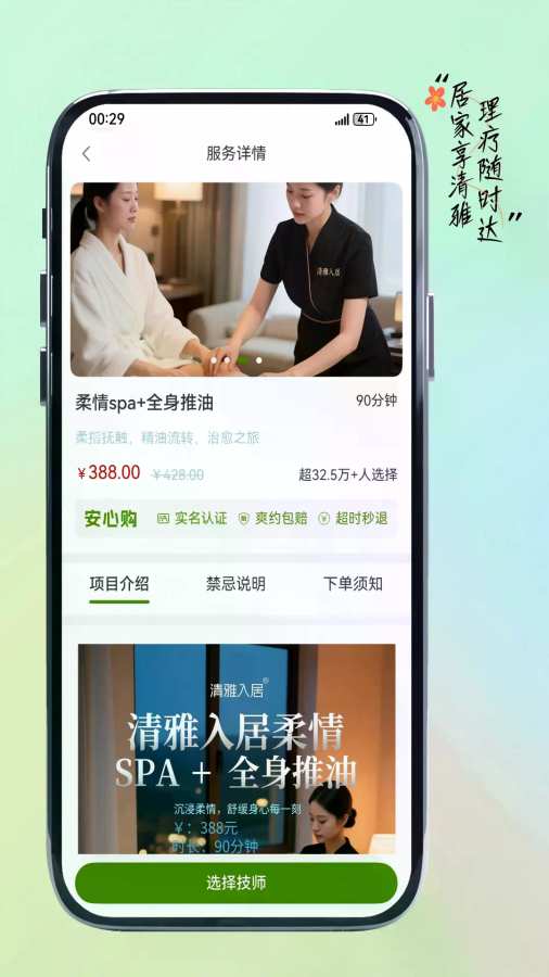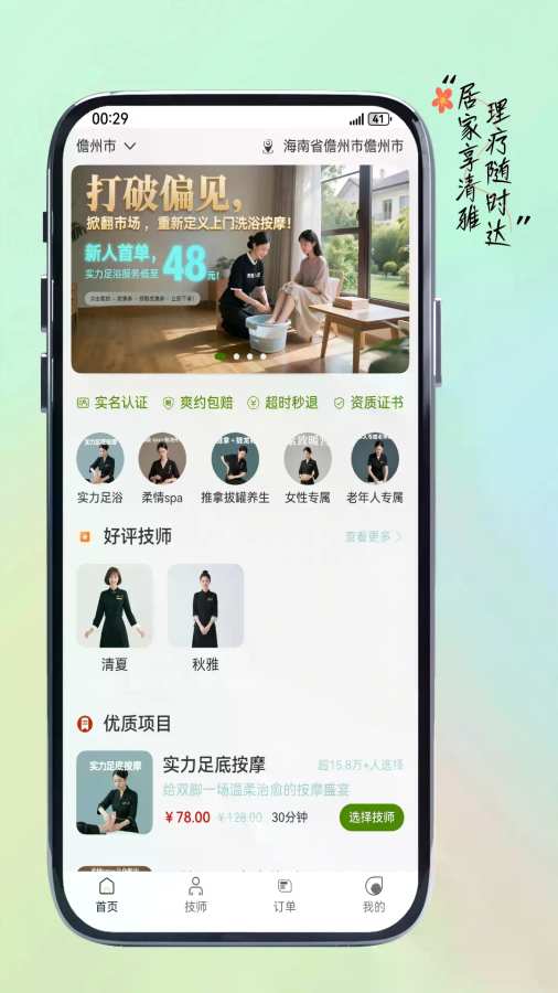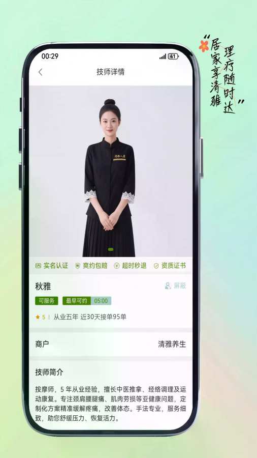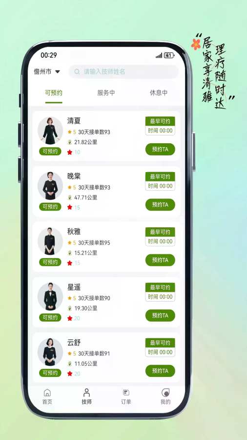 清雅入居是一款基于O2O模式的理疗按摩服务平台,旨在为用户提供便捷、专业的理疗按摩服务。用户可通过App在线预约理疗师,在家即可享受轻松理疗服务,涵盖中医推拿、经络调理、肩颈放松等多种理疗项目。平台严格审核理疗师资质,确保服务安全可靠,同时提供用户评价、在线支付、订单管理等功能,提升用户体验。 来自应用汇: 清雅入居