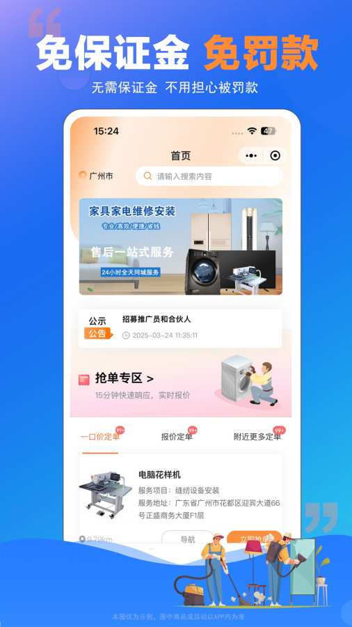 1.网购订单:安装、配送、维修、测量、调试2.家政服务:小时工、家电清洗、家具养护、开荒保洁、保姆、月嫂、疏通
