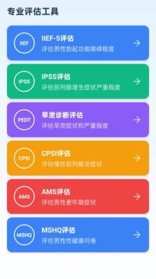 核心亮点是专业评估工具与症状自查结合。在检查自测功能中,提供多种专业评估。多维度守护男性健康,为男科健康管理提供科学、实用的工具支持,帮助男性及时发现健康隐患,做好日常健康维护 。