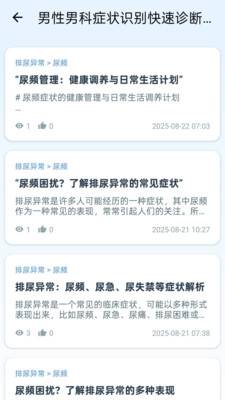 内置健康资讯板块,整合男科领域的预防要点、日常养护、诊疗常识等内容,定期更新推送。用户可随时点击探索,从多维度提升健康认知,为日常健康管理积累知识储备。