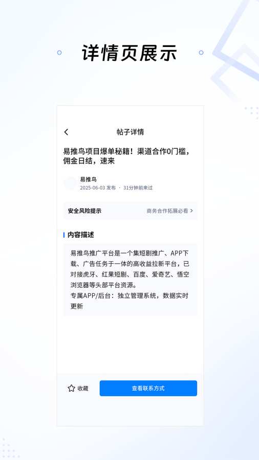 推巴克是一个围绕“项目与商机”的合作拓展平台,同时用户可在平台内发布信息,从而引流获客!发现项目、推广项目,项目合作与人脉拓展,上推巴克APP! 来自应用汇: 推巴克