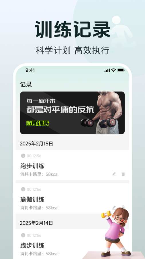 提供训练记录的详细回顾功能,支持编辑和删除操作。