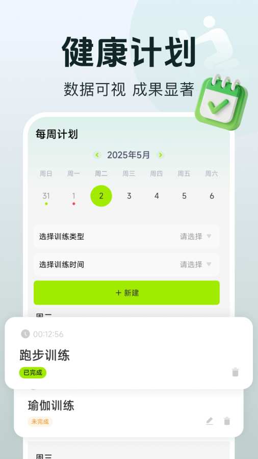 用户可制定每周训练计划,标记训练日期,选择运动类型与时间。