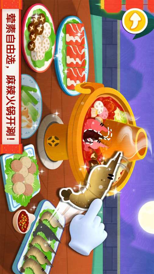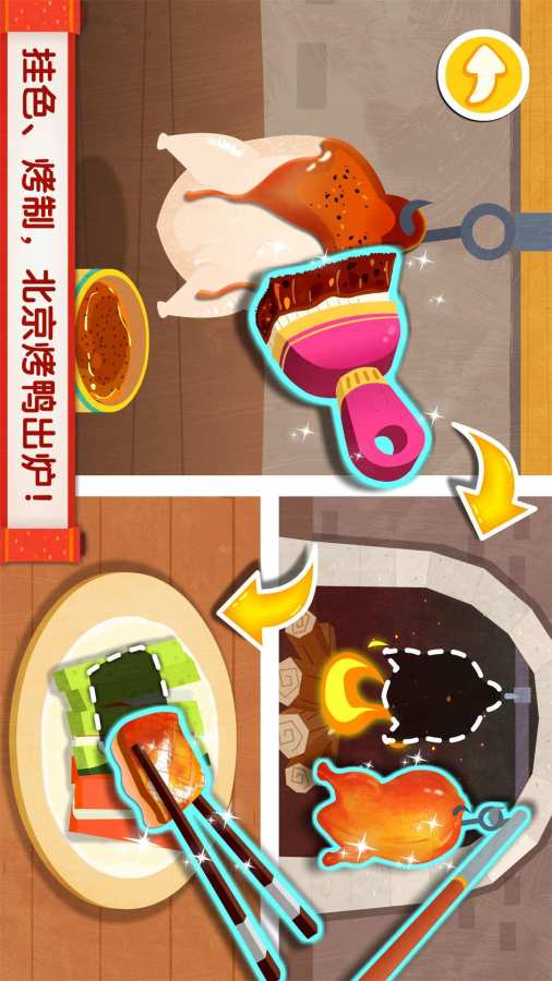 对“片鸭”的刀工也有高要求——宝宝必须快速滑动屏幕上的刀,保证鸭肉热腾、鸭皮酥脆地一整片切下来,搭配葱丝、黄瓜条,卷在薄饼里,蘸上甜辣酱,地道烤鸭出炉。