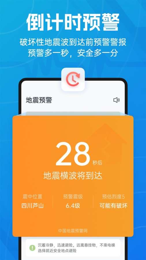 信息来自中国地震预警网。在地震发生时提前几秒到几十秒预警,可自主设置预警触发策略;可及时查看震中位置、预警震级、预估烈度、预警时间等预警信息;可紧急上传求救信息;支持预警科普、查询预警记录。