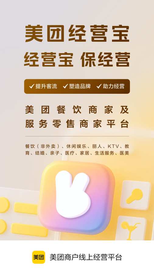 「美团经营宝」是美团餐饮商家及服务零售商家健康经营发展的长期陪伴者,合作后商家可畅享线上开店、数据分析、评价管理等功能。
