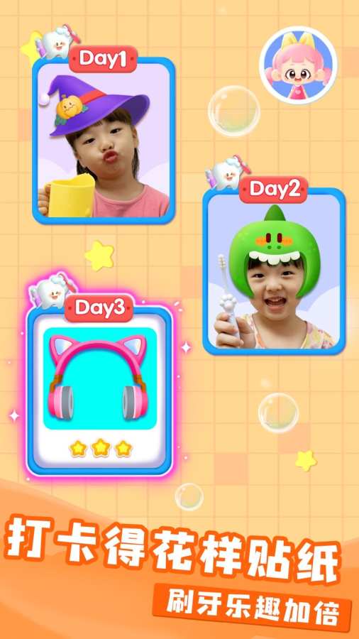 屏幕上还有一个动态贴纸!这是宝宝每天可以解锁的“新造型”:今天“戴”恐龙帽,变身小恐龙;明天“换”公主皇冠,你就是勇敢公主!