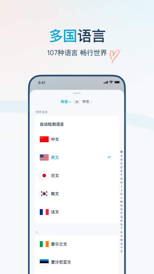 翻译语种:支持英语、日语、韩语、法语、俄语、西班牙语等107种语言翻译,覆盖186个国家,英语翻译、出国翻译、旅行翻译、旅游购物都不用担心。