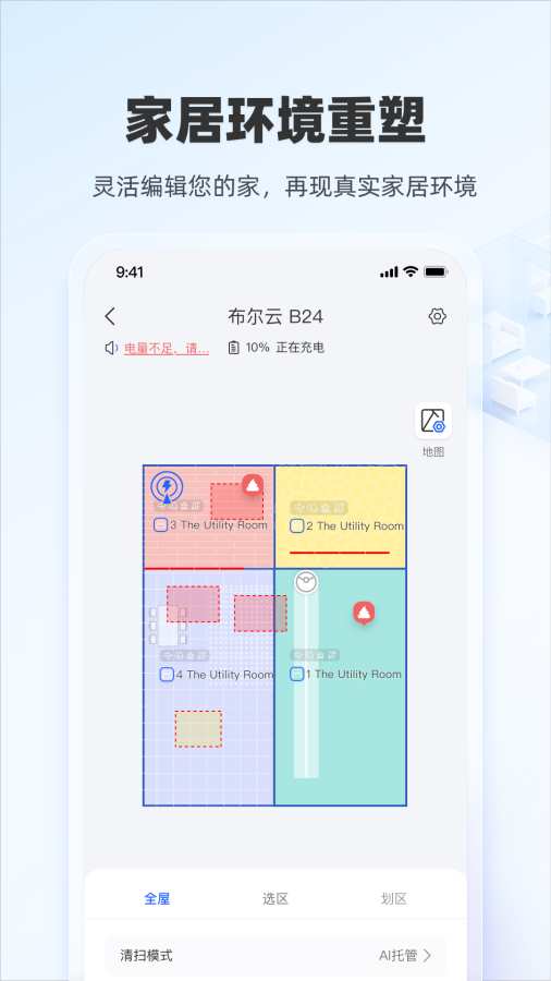 · 家居环境重塑: APP强大的地图编辑功能,让您能灵活重塑您的家居环境:随心拆分或合并房间、精准设置禁区(如宠物区、儿童玩耍区)和地毯区域、智能布置管理家具位置、精细调整户型细节。APP完美再现您真实的家居布局,让清扫规划更智能、更贴合您的实际需求。