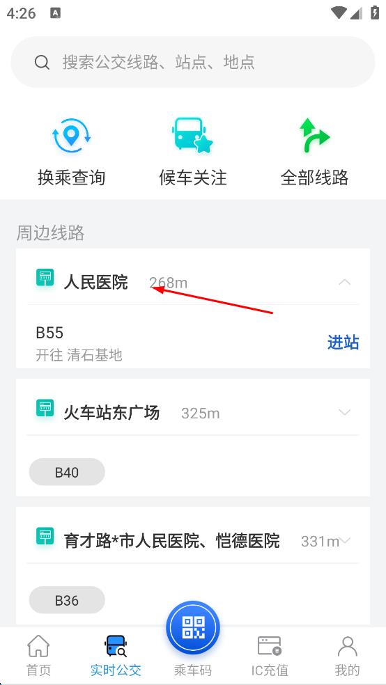 1、打开公交应用,在首页点击实时公交功能,进入实时公交页面,可看到换乘查询、候车关注等选项及周边线路。