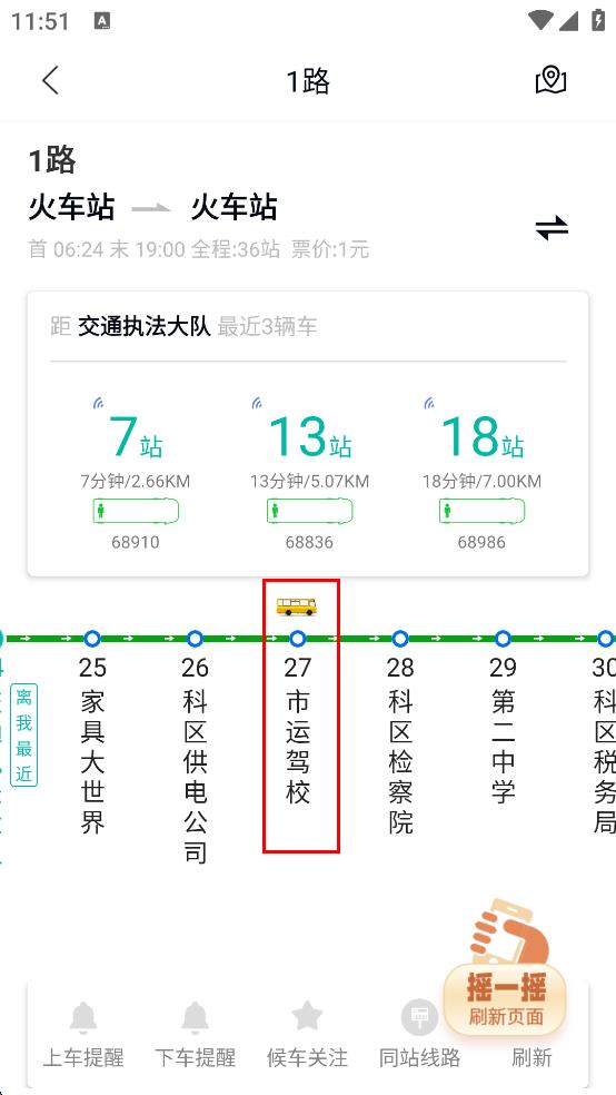 4、点击后进入到“1路”公交的详情页面,可查看该线路的站点、首末车时间、票价以及公交实时位置等信息,方便规划出行。