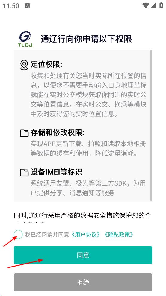 1、打开通辽行应用,弹出权限申请提示框,勾选我已经阅读并同意用户协议和隐私政策,点击“同意”,进入到应用主界面。