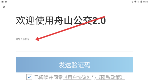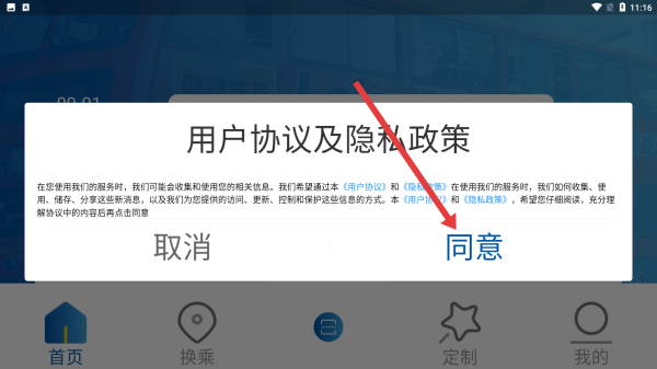 1、在进入到舟山公交APP中,点击同意按钮后开始使用舟山公交。