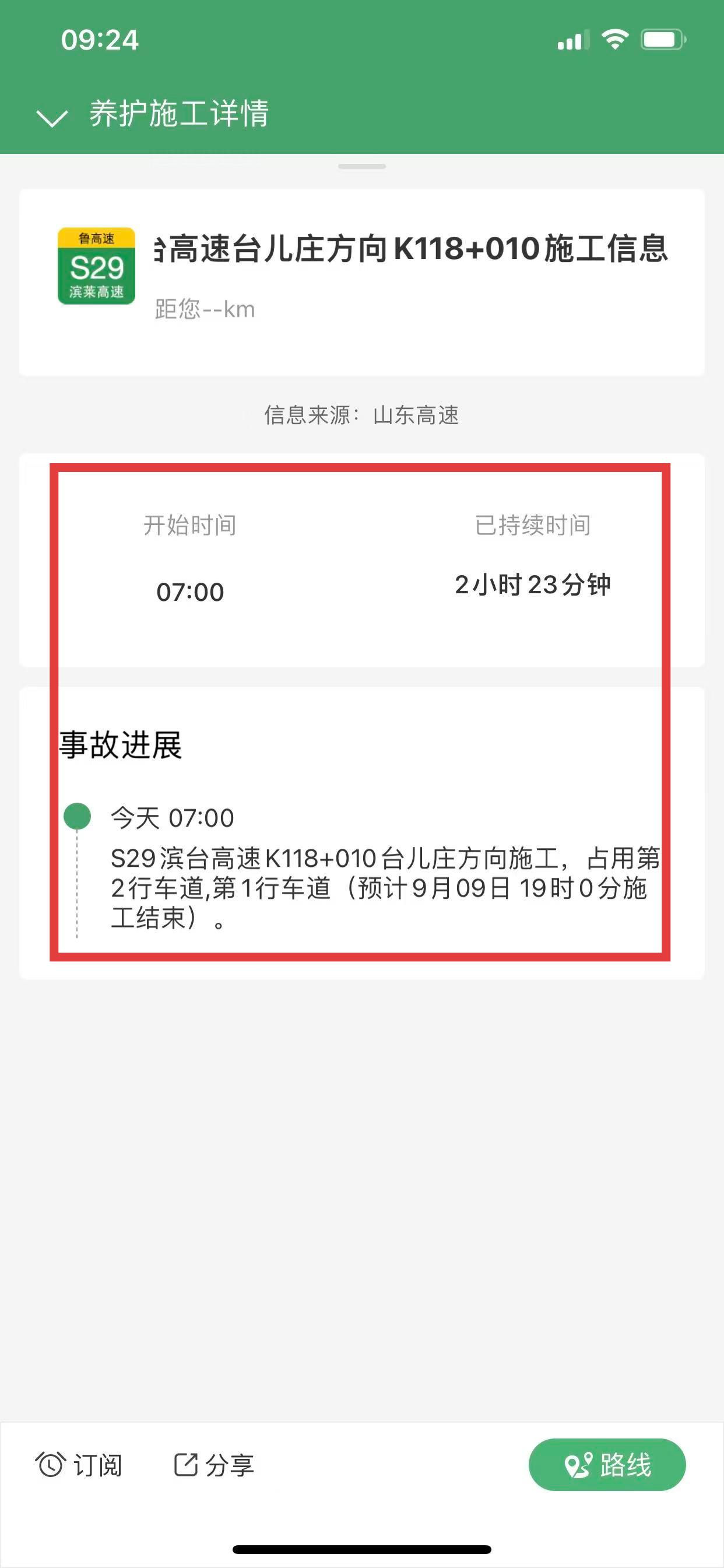 3、点击具体的路况信息条后,会显示养护施工详情或事故详情,包括开始时间、已持续时间、事故进展等信息。