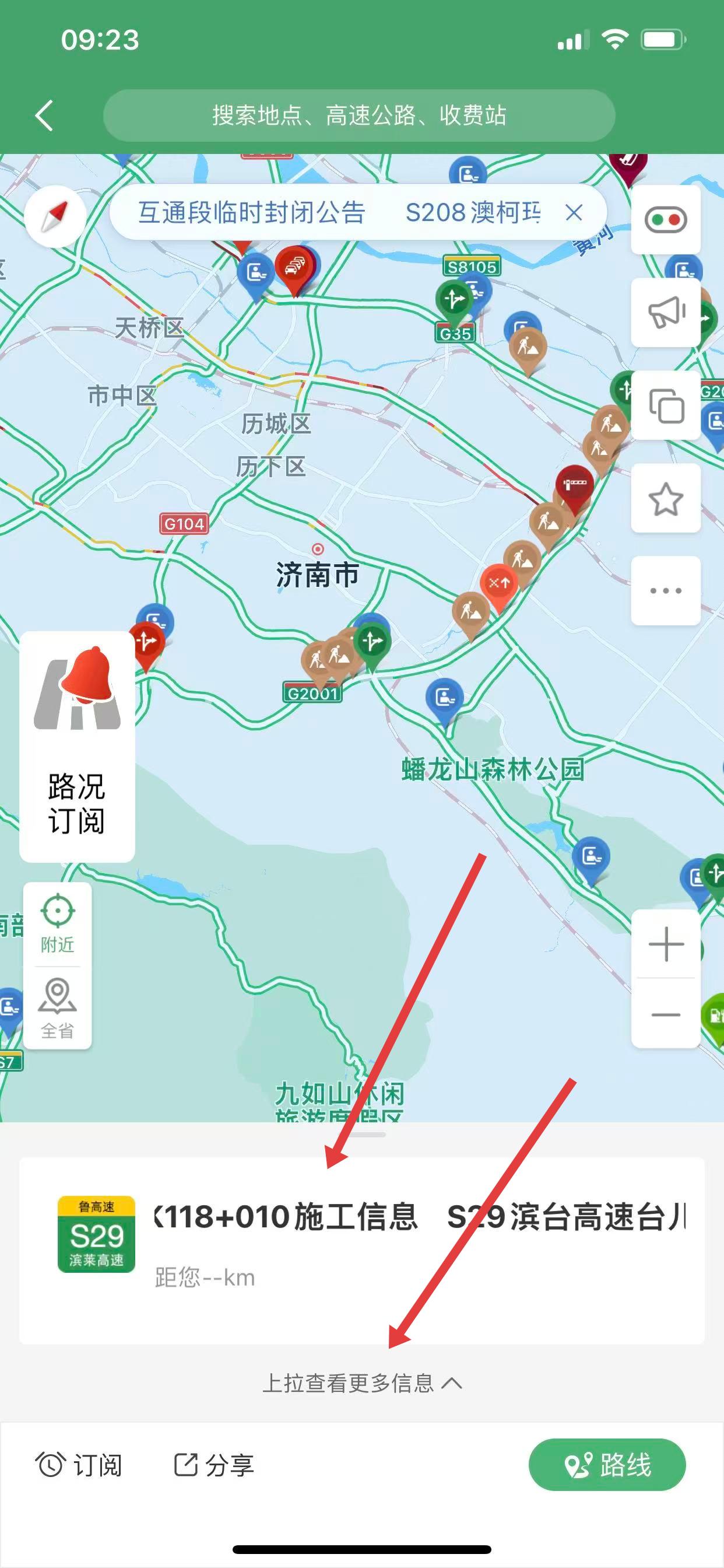 2、地图显示高速路段的路况信息,不同颜色代表不同路况,上拉查看更多信息。