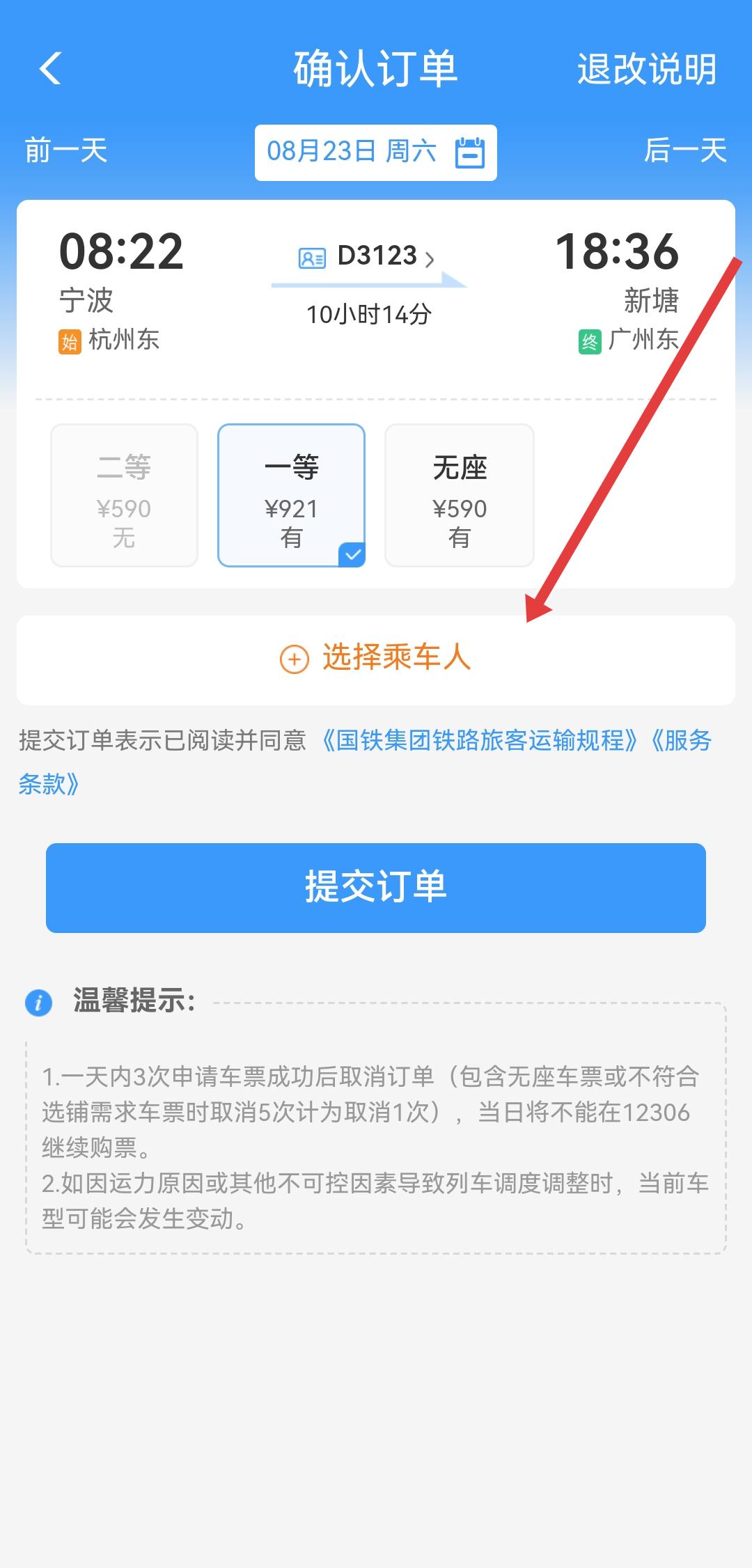 3、在确认订单页面,选择座位类型,点击选择乘车人按钮,勾选乘车人信息后返回订单页,确认信息无误后点击提交订单。