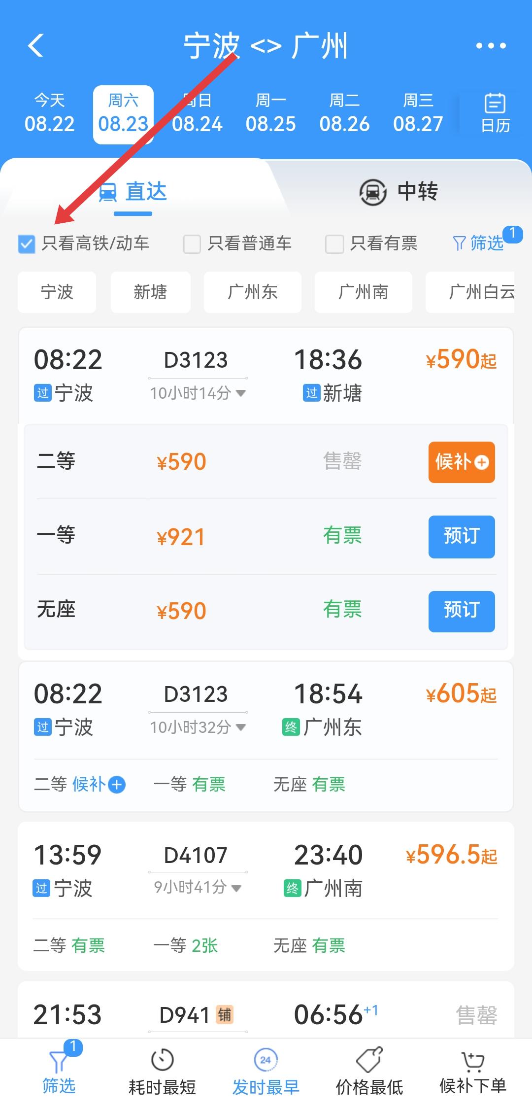 2、在车次列表页面,勾选只看高铁/动车筛选条件,查看符合要求的高铁车次,点击目标车次进入订单确认页面。