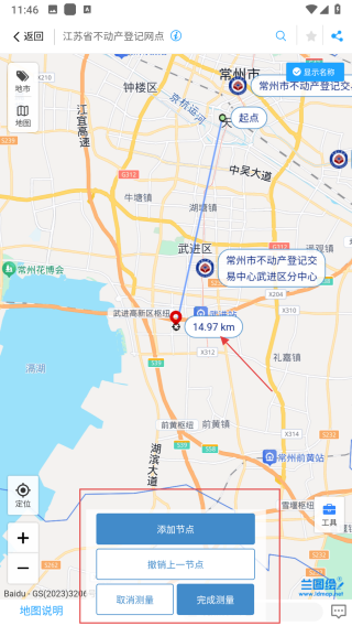 4、进入距离测量模式后,点击添加节点选取测量的起点、终点即可获取数据。