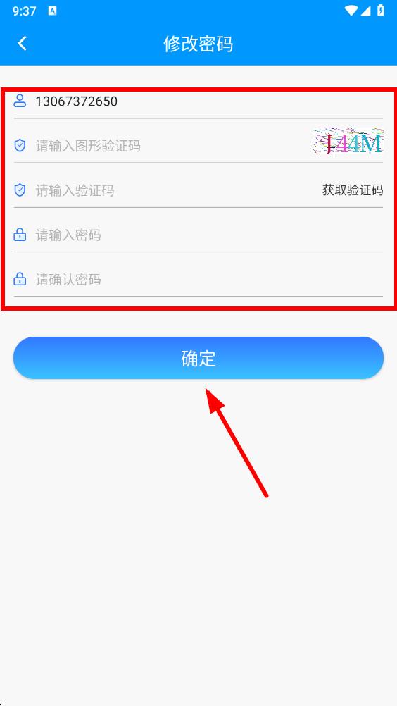 5、在修改密码页面,按要求输入图形验证码、获取并输入验证码,设置新密码并确认密码,最后点击确定即可完成密码修改。