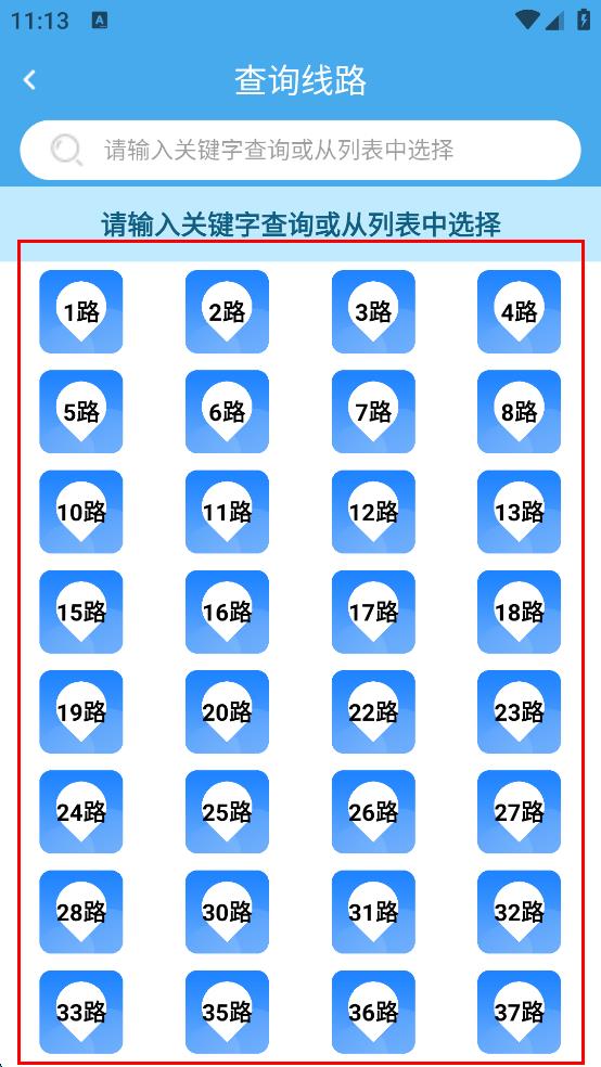 2、在应用主界面,找到“公交车”选项,点击该选项,进入查询线路界面,准备选择要查询的公交路线。