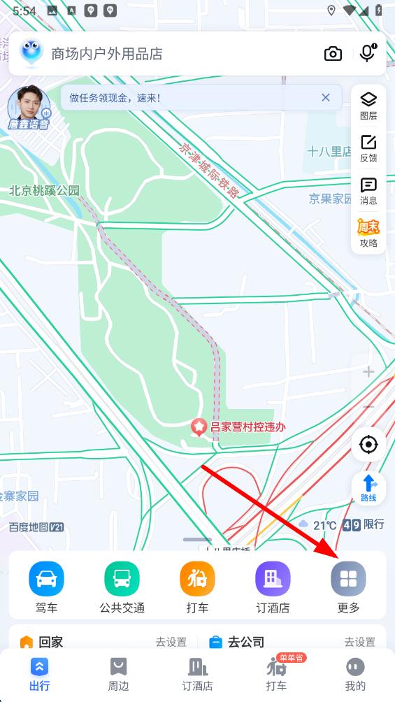 2、在地图主界面,点击下方功能栏中的更多按钮,进入更多功能选择页面,以便查找步行导航相关功能。