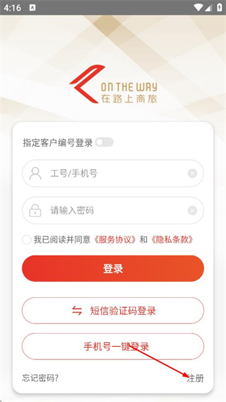 1、在温馨提示弹窗中,点击同意,进入在路上商旅的登录页面。