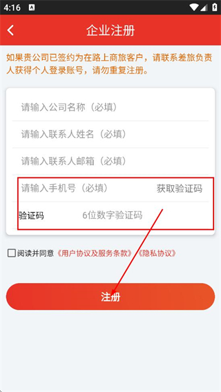 4、填写手机号,点击获取验证码后填写验证码,点击注册,完成企业账号注册。