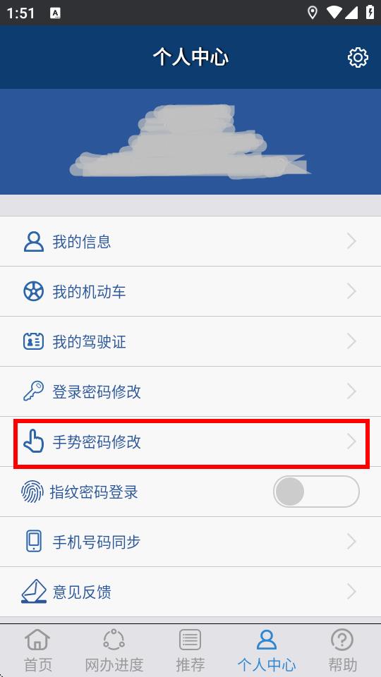 2、在个人中心页面里,找到手势密码修改选项并点击进入。