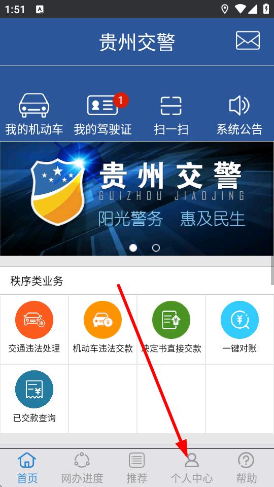 1、打开贵州交警app,进入首页后点击底部导航栏的个人中心选项。