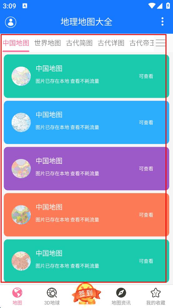 1、打开地理地图大全APP,进入“地理地图大全”页面,在页面上方的分类选项中,找到“中国地图”分类并点击,进入中国地图列表页面。