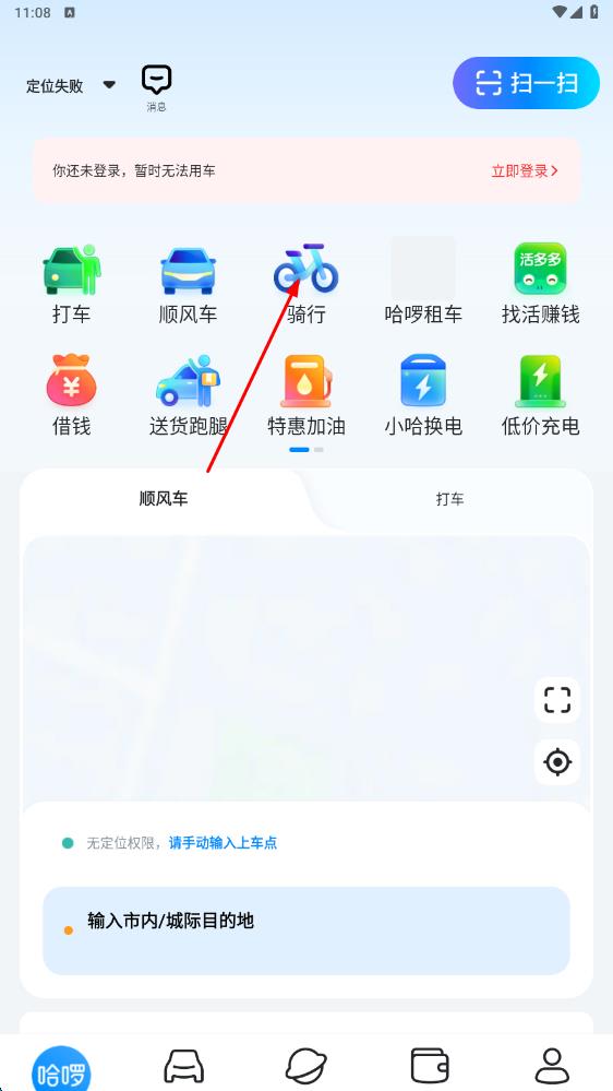 3、在应用主界面,找到骑行图标并点击,进入骑行功能页面,即可进行后续扫码用车等骑行相关操作。
