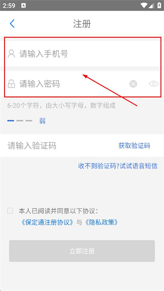 4、在注册页面,填写请输入手机号,并设置符合要求的请输入密码。