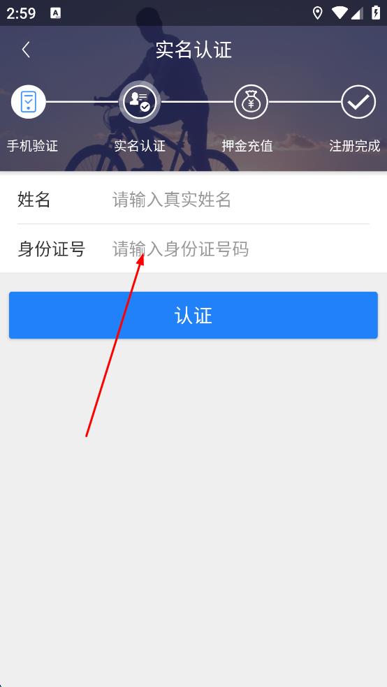 3、完成手机验证后,进入实名认证页面,在“姓名”输入框中输入真实姓名,在“身份证号”输入框中输入身份证号码,点击“认证”按钮,即可完成注册登录相关操作。