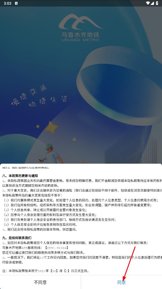 1、打开乌鲁木齐地铁APP,阅读隐私政策后点击“同意”,进入“我的”页面,点击“点击登录”。