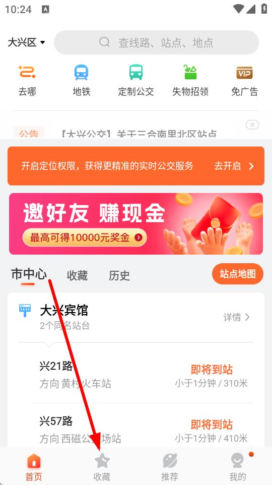 1、打开掌上公交App,进入首页,点击底部导航栏中的收藏选项。