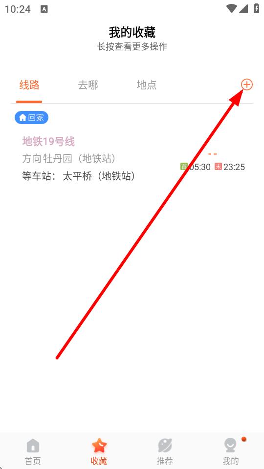 2、在收藏界面中,点击线路栏右上角的+号。