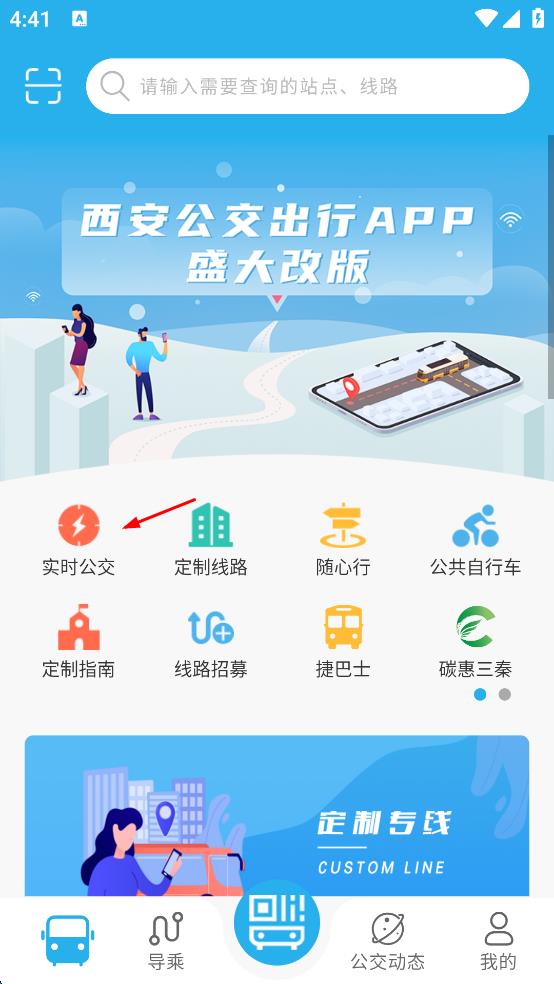 1、打开西安公交出行APP,进入主界面后,点击“实时公交”选项,进入实时公交查询页面,在页面中找到站点相关的线路信息。