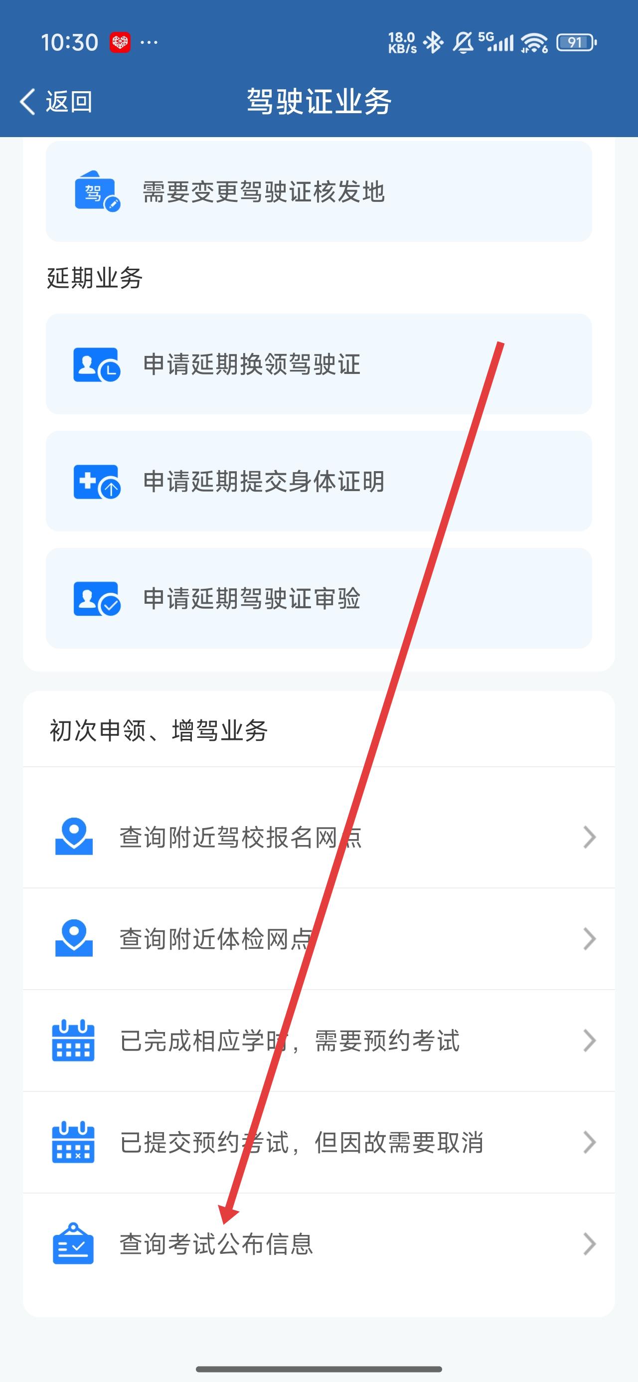 2、在进入到驾驶证业务页面中,可以点击查询考试公布信息选项,进入查询。