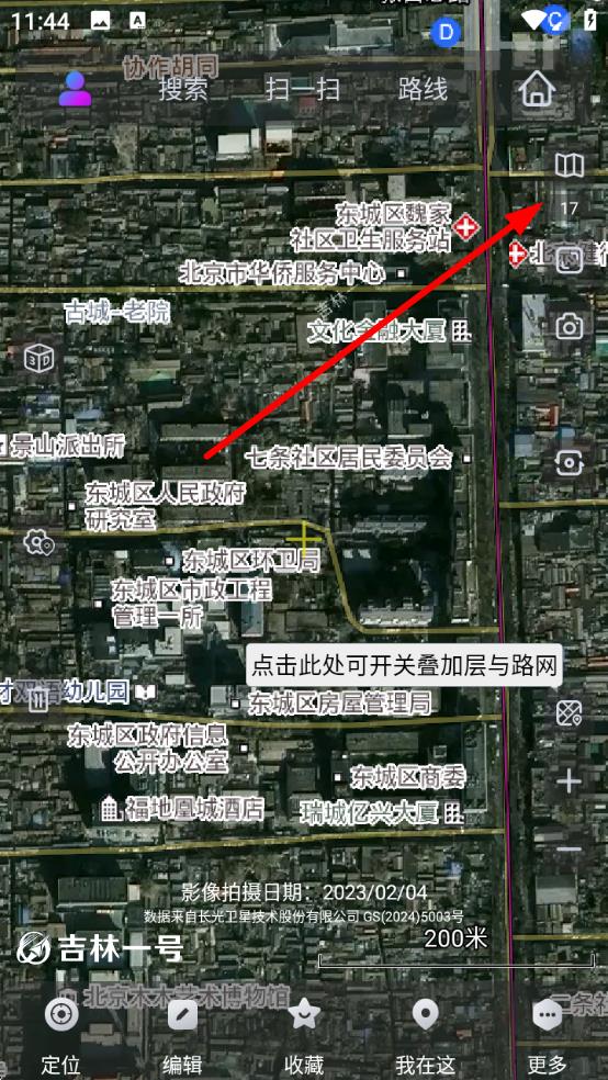 3、切换完成后,在地图上找到目标地点,放大地图,若该区域支持街景,会有相应标识,点击标识即可查看街景。