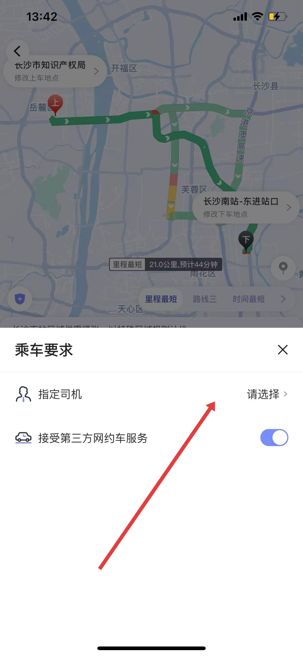 3、在弹出的乘车要求界面中,点击指定司机右侧的请选择。