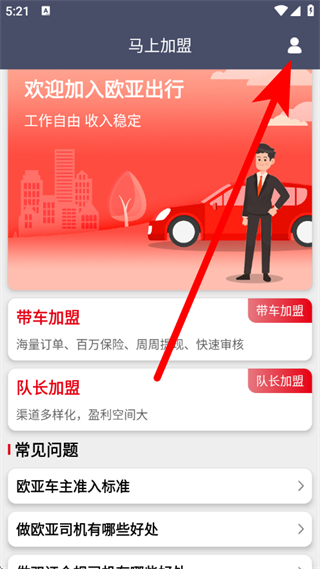 1、打开欧亚出行,点击右上角的个人图标,进入个人中心。