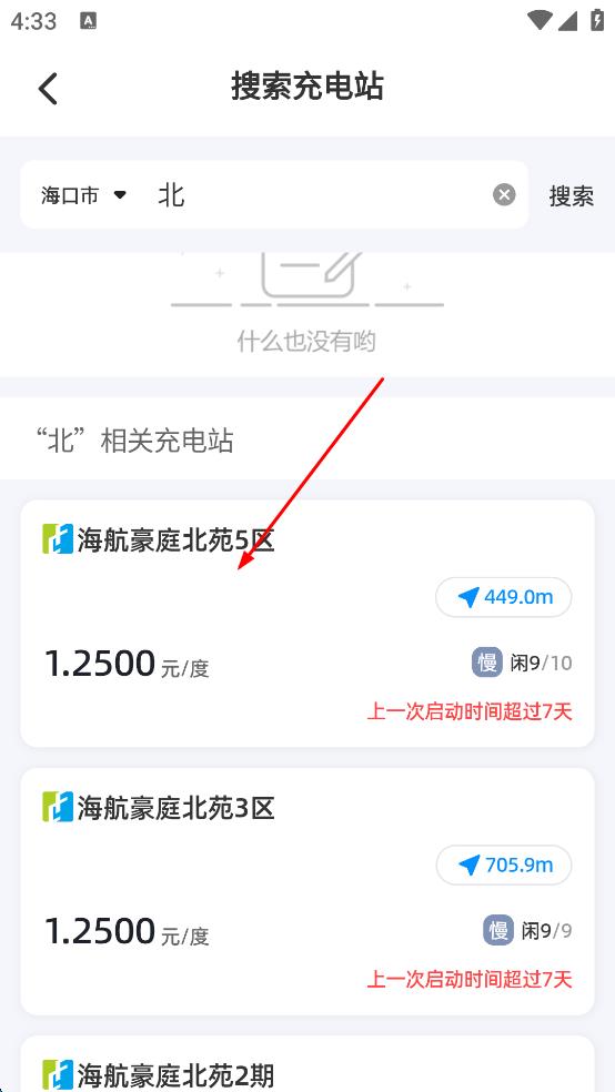 3、在搜索结果中,选择心仪充电站(如海航豪庭北苑5区 ),查看其距离、电价、空闲桩等信息,准备前往充电。
