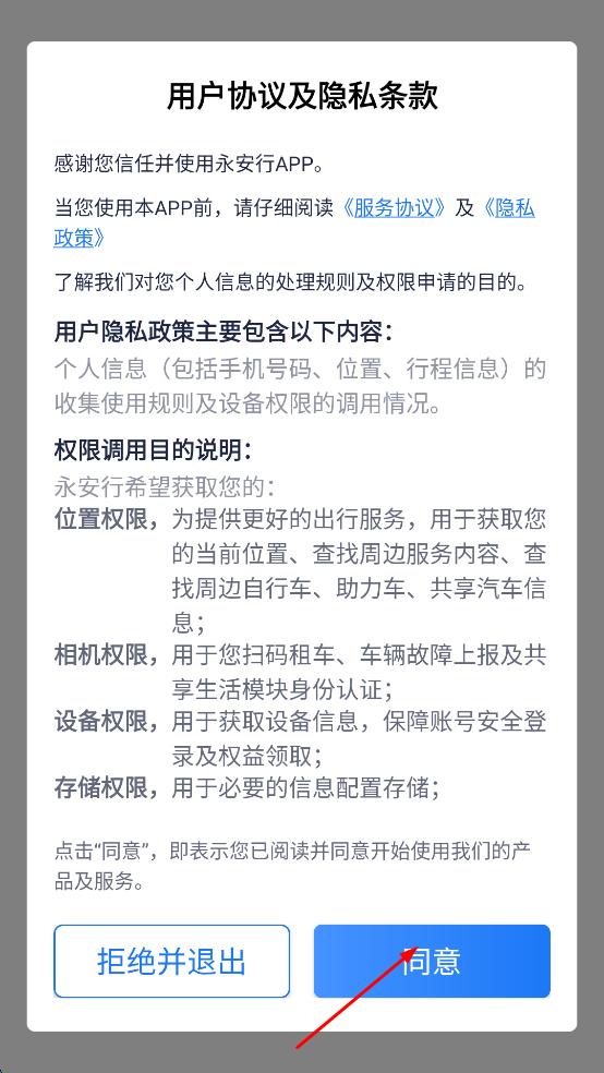 1、打开永安行APP,弹出用户协议及隐私条款框,阅读后点击同意,确认接受协议内容进入APP。