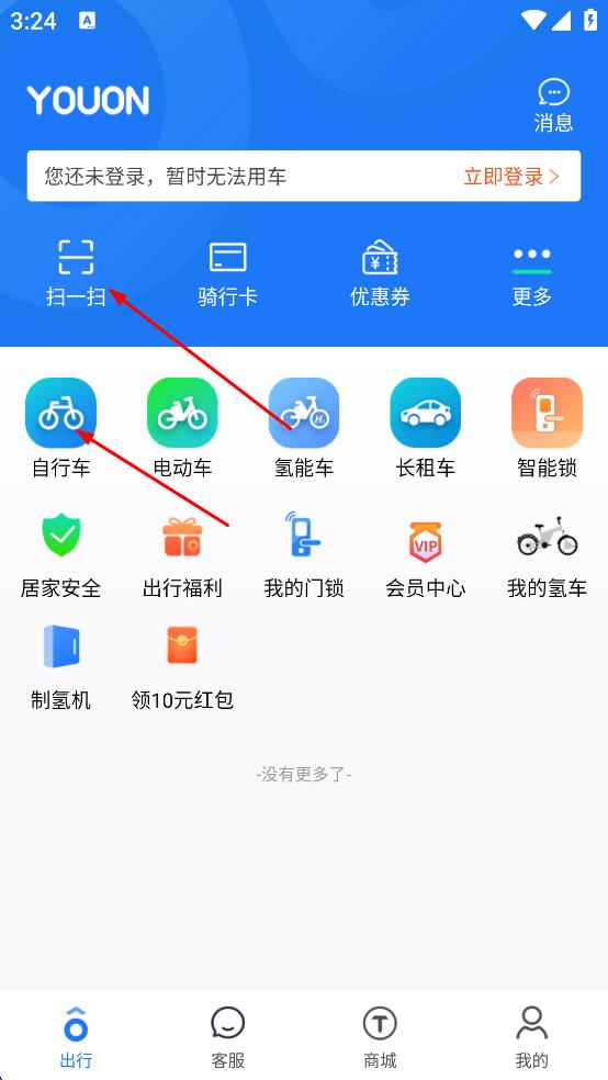3、登录后回到出行页面,点击扫一扫,对准自行车二维码扫描,或直接点自行车选项,开始用车 。