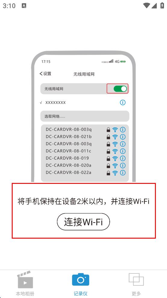 2、点击“连接记录仪”按钮,进入连接准备界面,按照提示,将手机保持在设备2米以内,然后找到“连接Wi-Fi”按钮并点击。
