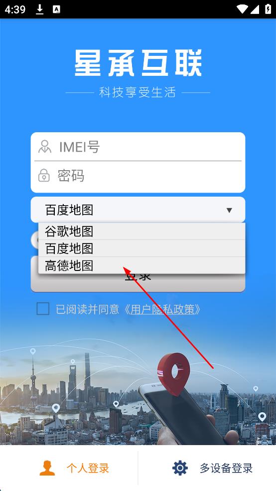 2、返回登录页面,点击地图选项下拉框,选择“高德地图”(或其他地图),准备输入登录信息 。